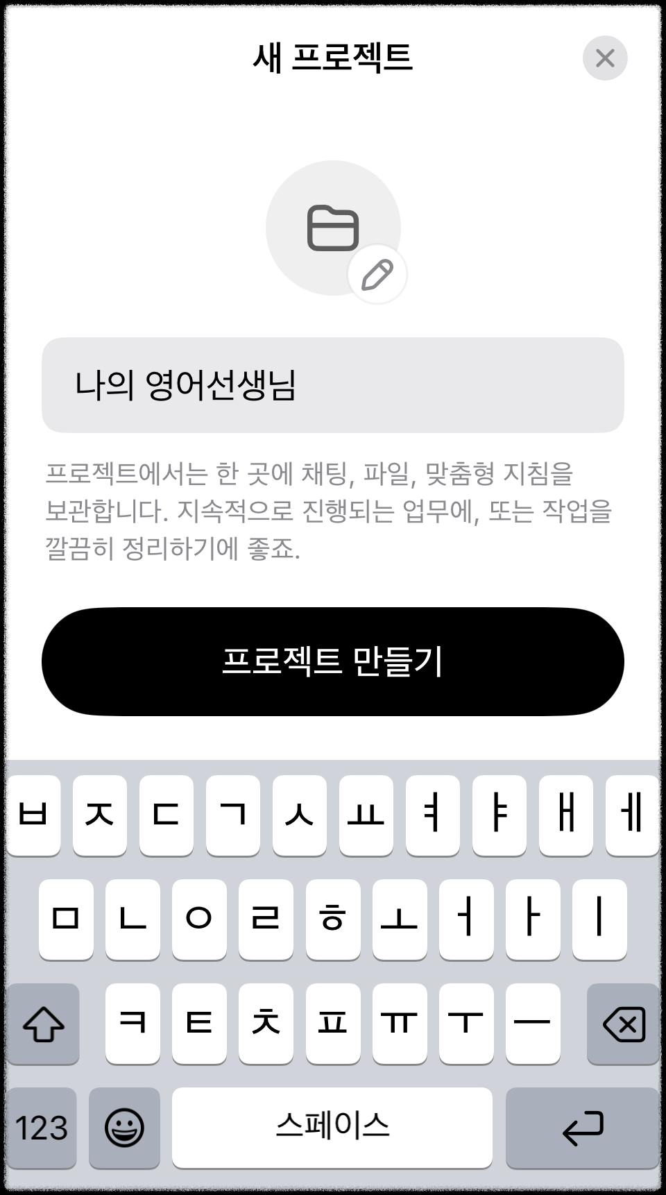 프로젝트 명은 자유롭게 설정하실 수 있는데, 저는 ‘나의 영어선생님’이라고 정했어요. 이 프로젝트 안에서 모든 채팅 기록, 파일, 설정을 깔끔하게 정리할 수 있어 장기적인 학습에도 좋습니다.